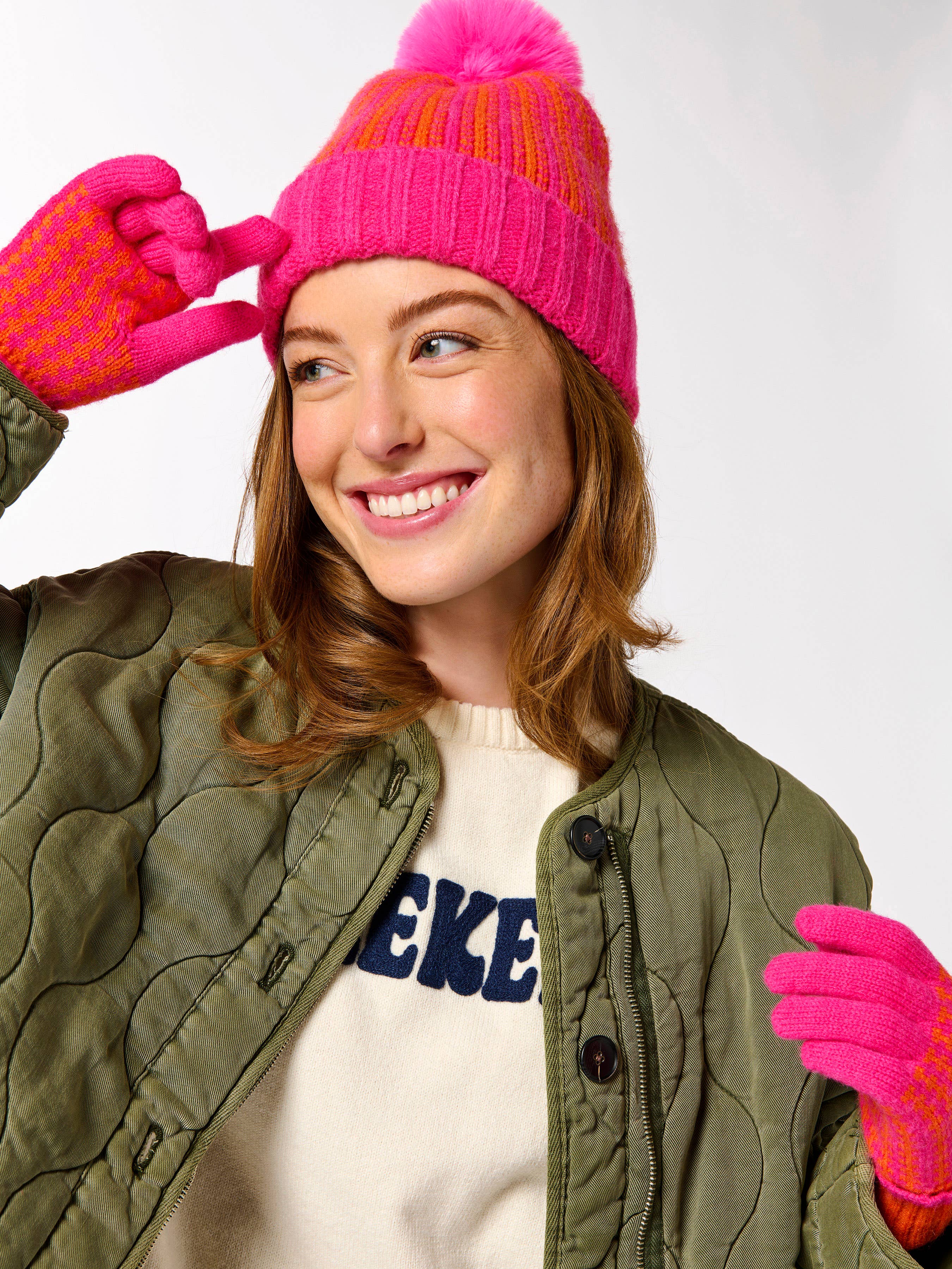 Brighten up your cold-weather style with the Hadley Houndstooth Beanie. Featuring bold colors, a playful houndstooth pattern, and a chunky knit design topped with a plush faux fur pom, this beanie adds charm and character to any winter outfit. The wide ribbed cuff provides a snug, cozy fit, keeping you warm from snowy strolls to coffee runs.